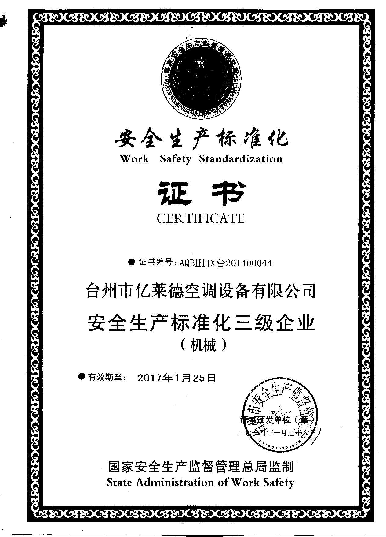 安全生產標準化證書