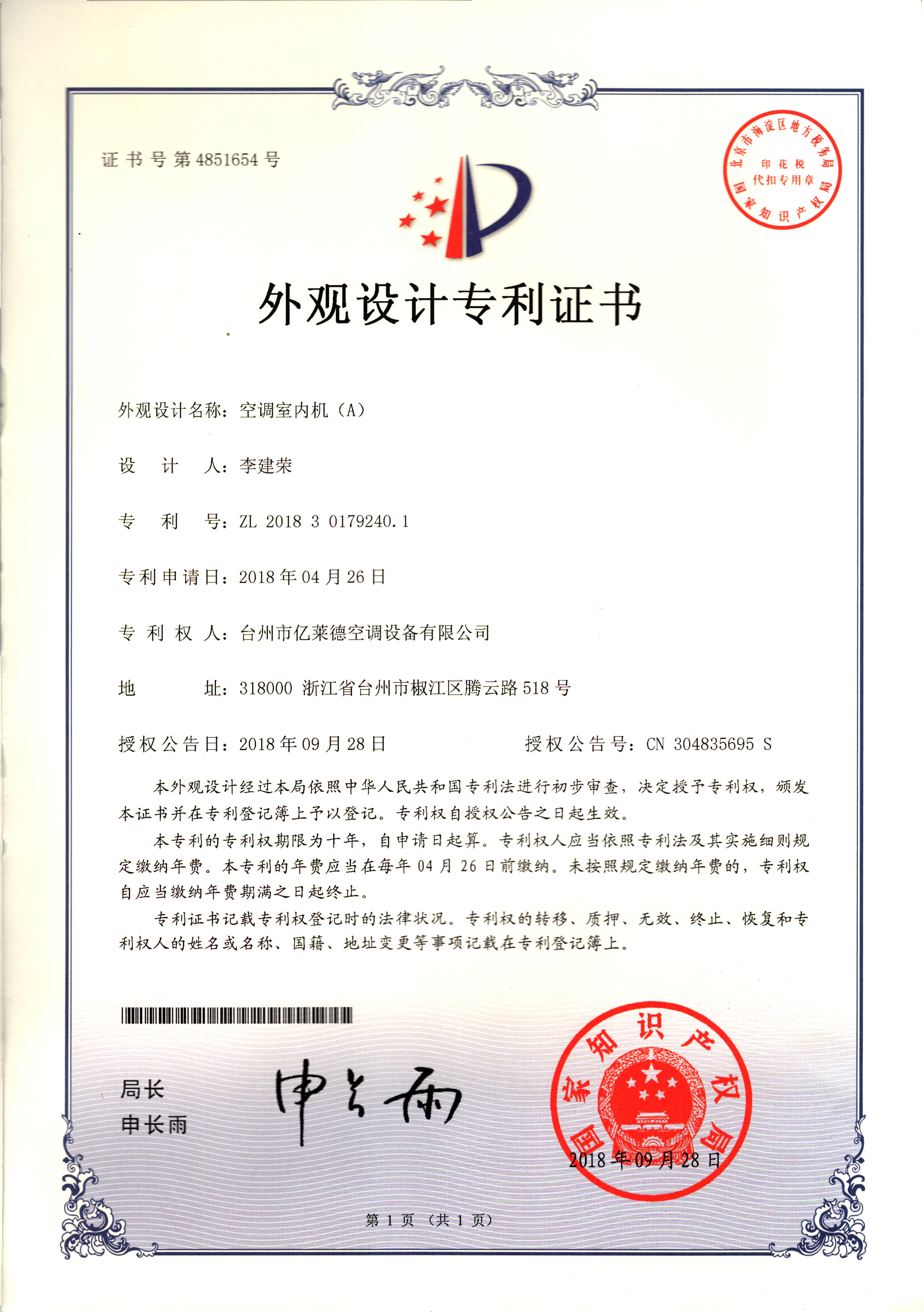 外觀設計專利證書--空調室內機(A...