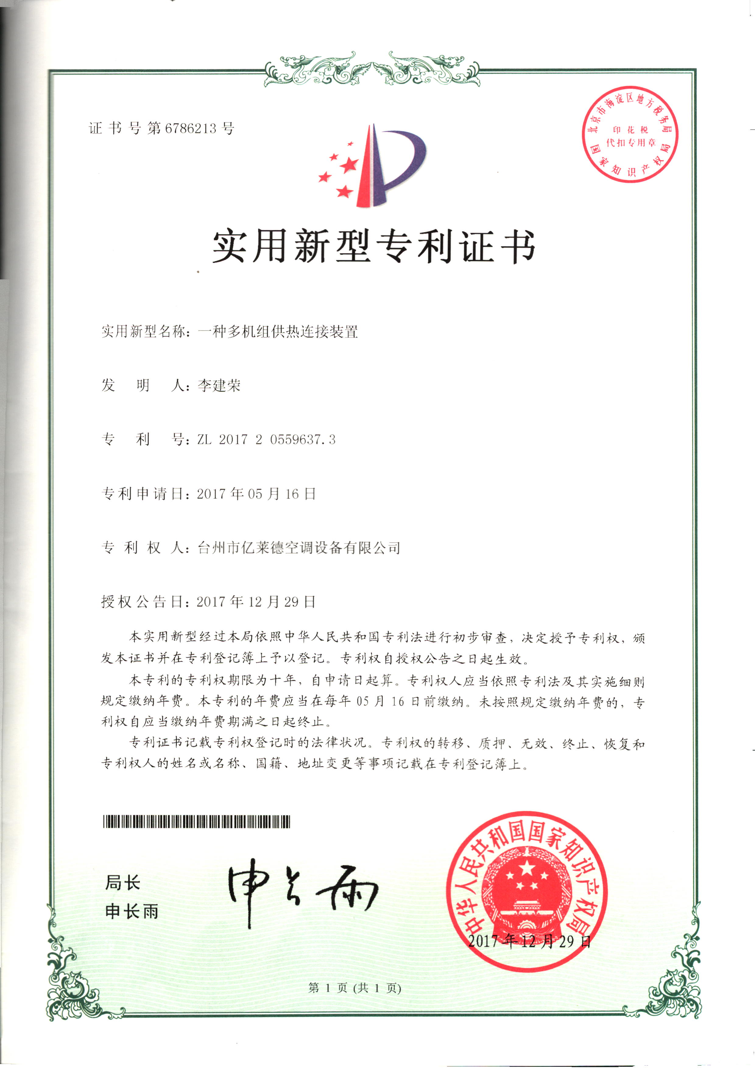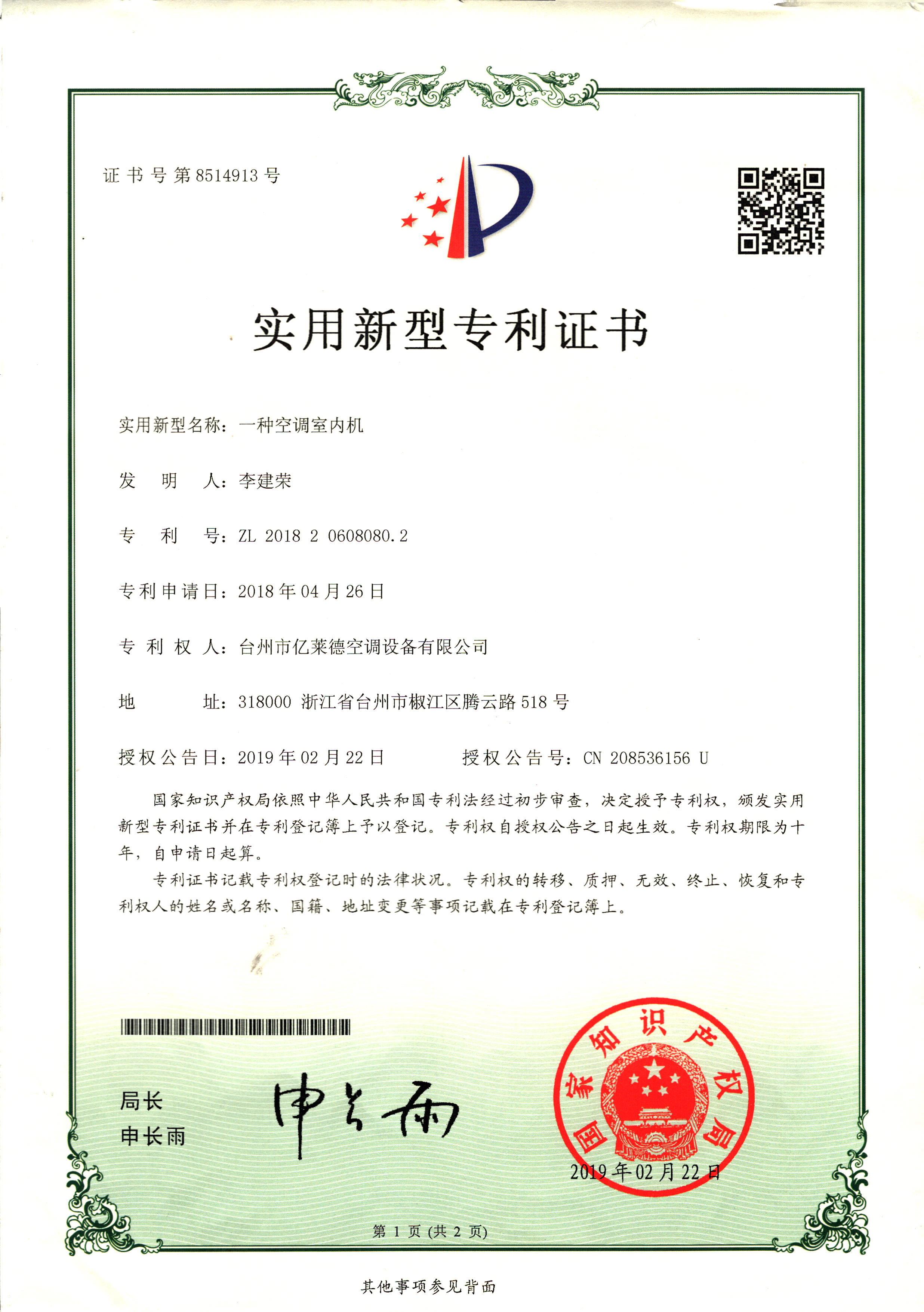 實用新型專利證書--一種室內冷暖...