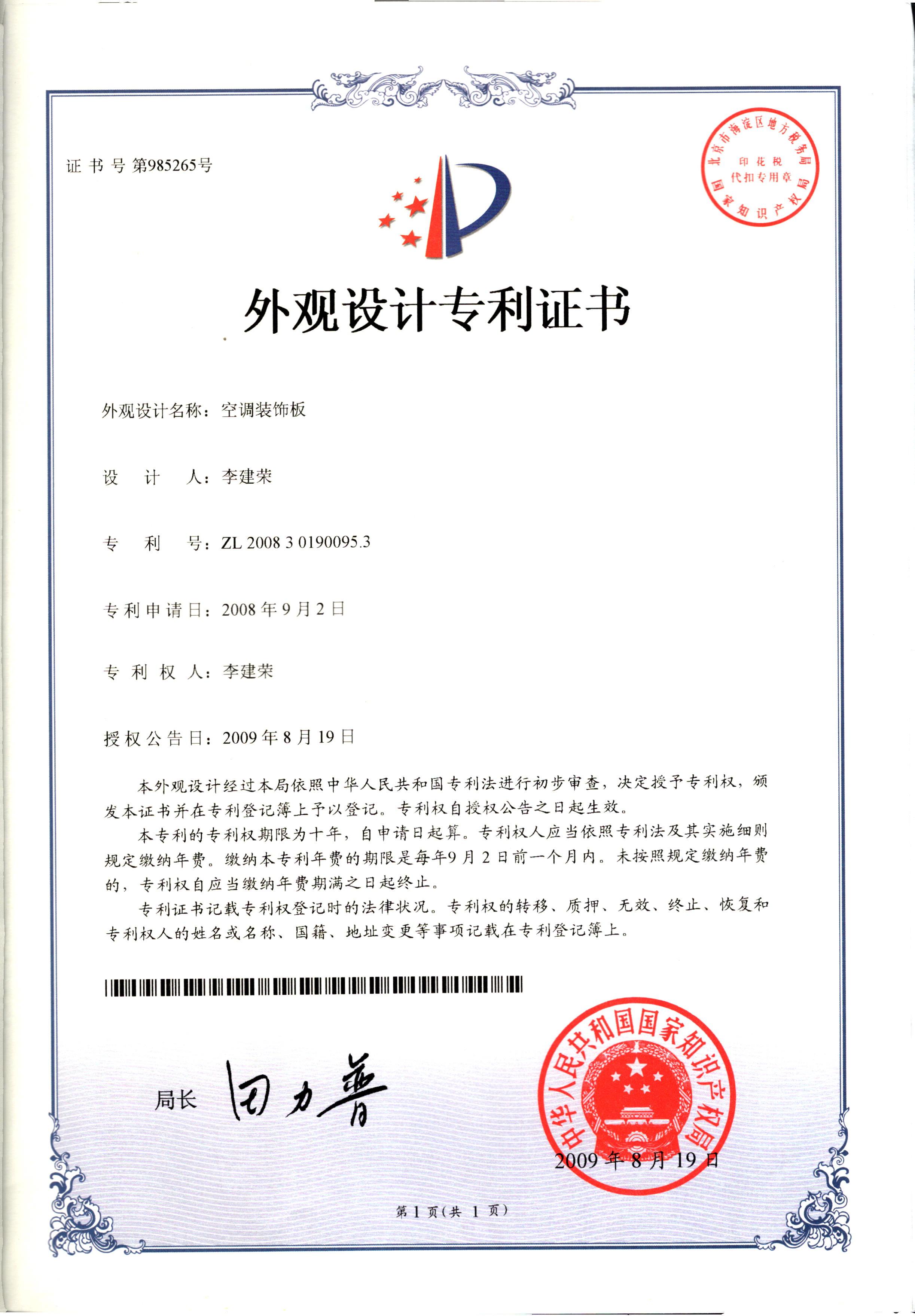 外觀設計專利證書--空調裝飾板