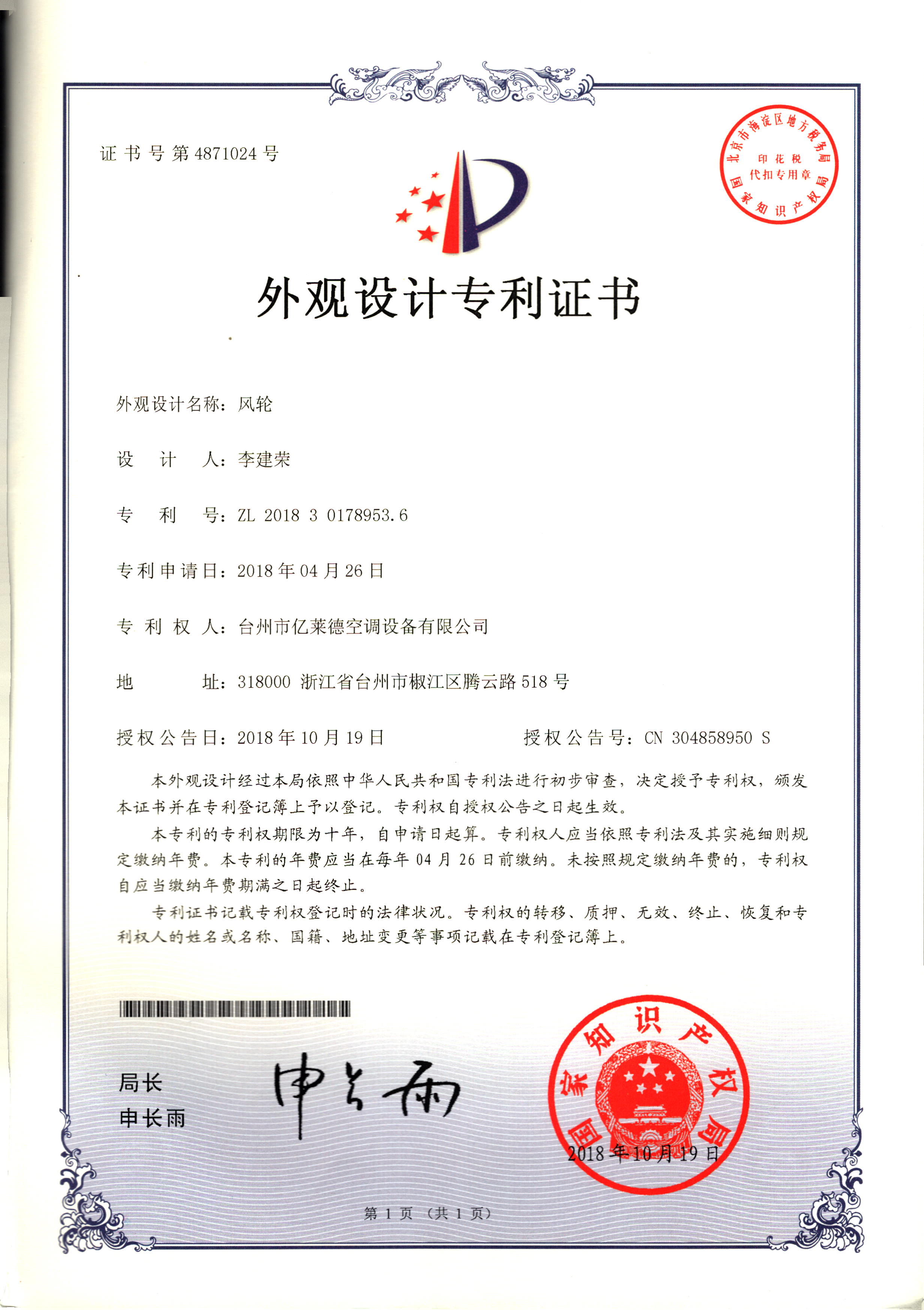 外觀設計專利證書--風輪