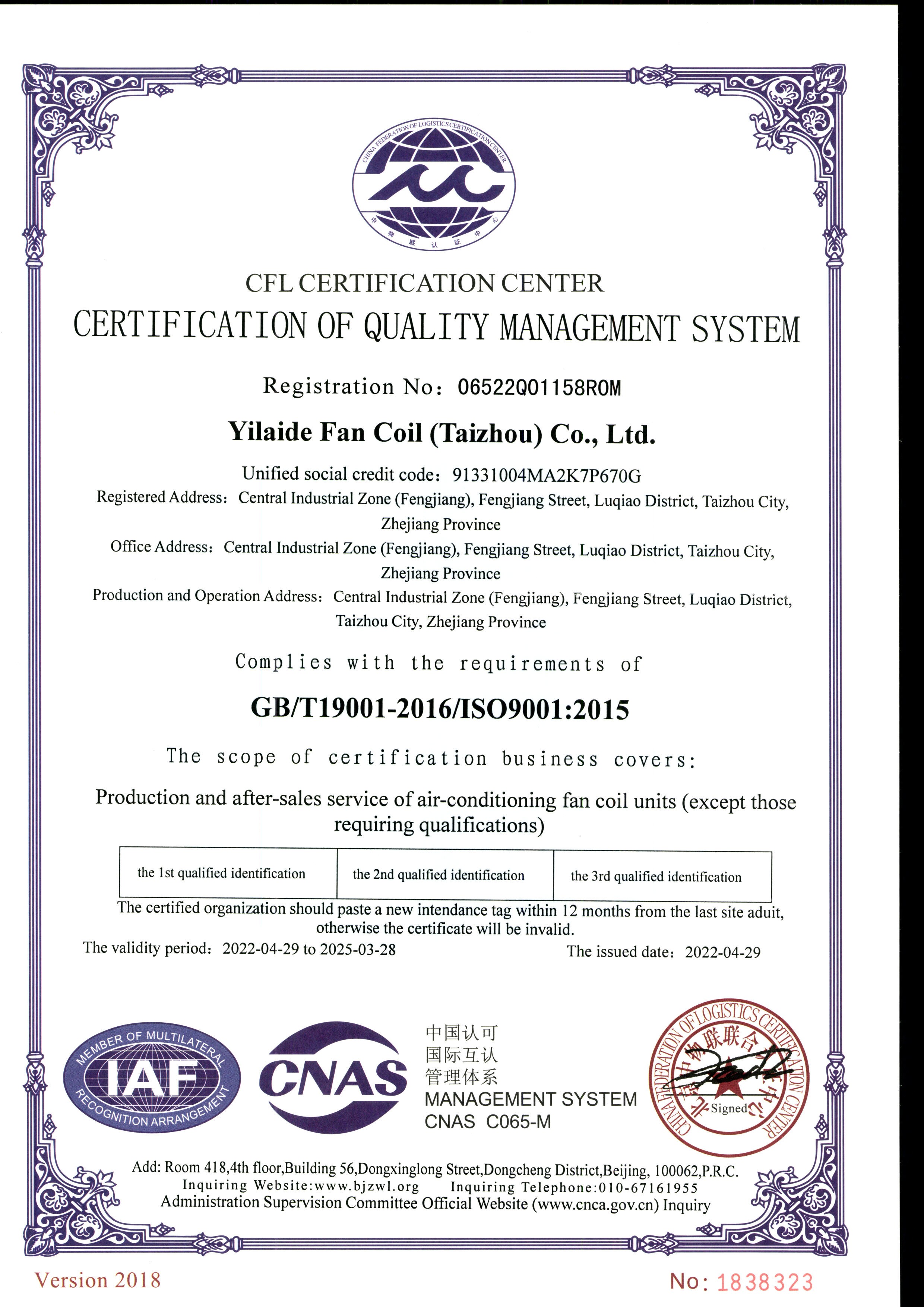 質量管理體系認證證書