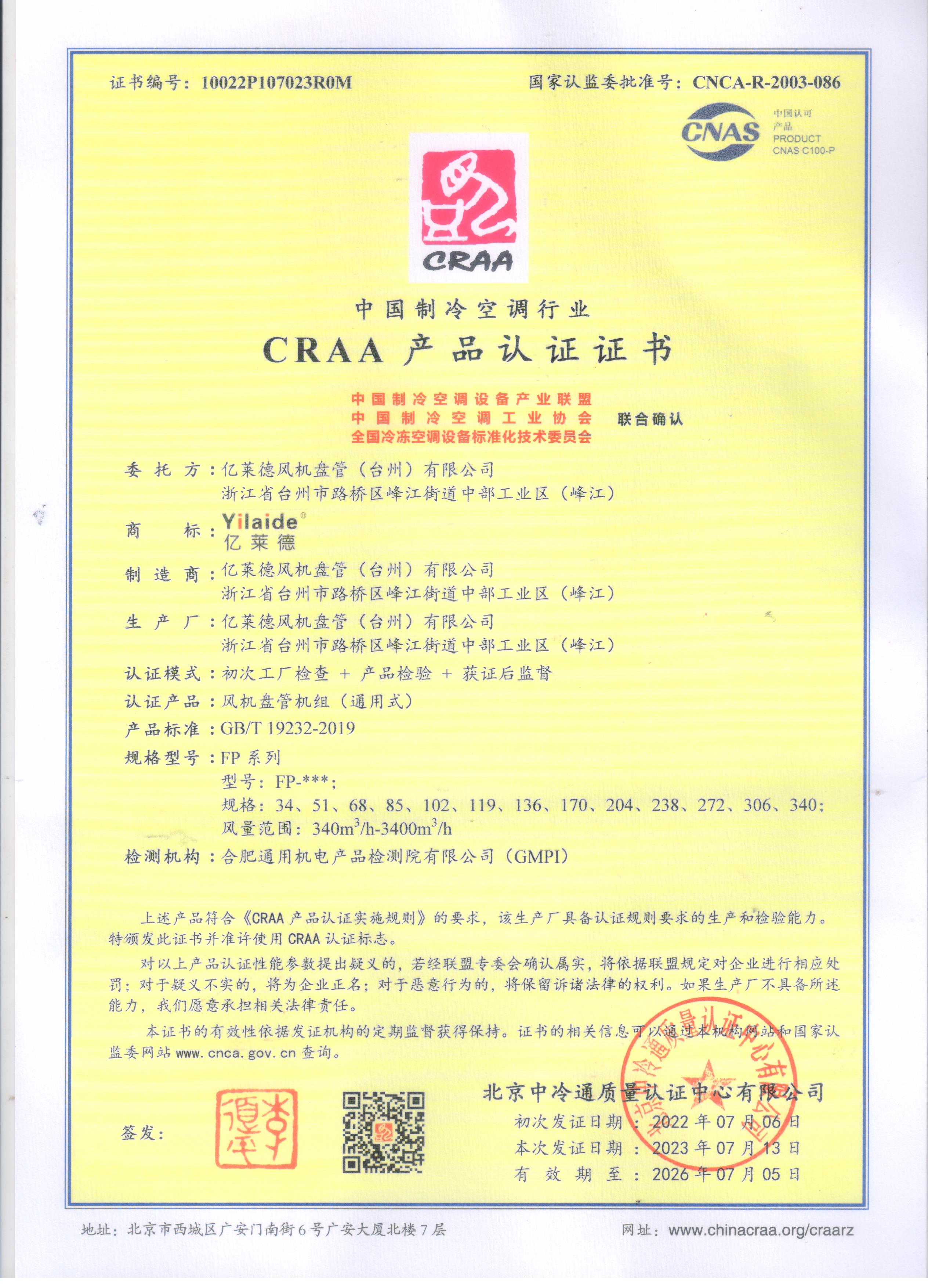 CRAA產品認證證書